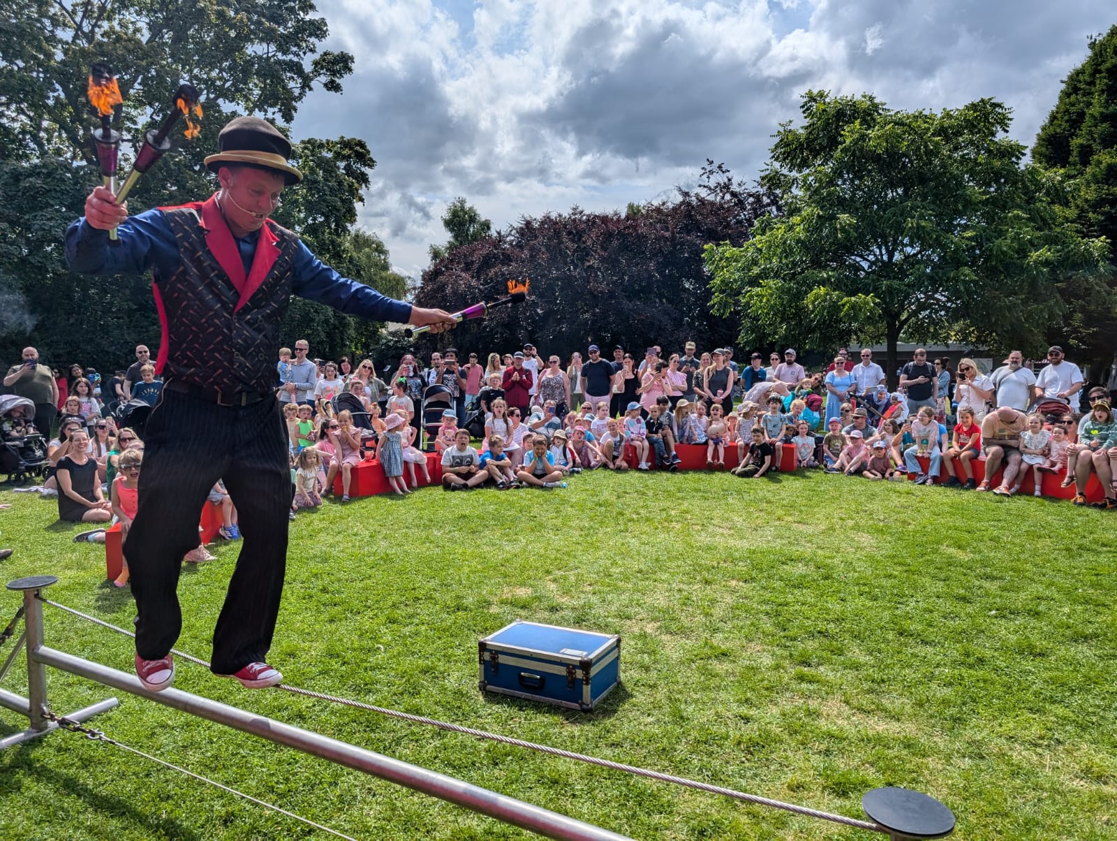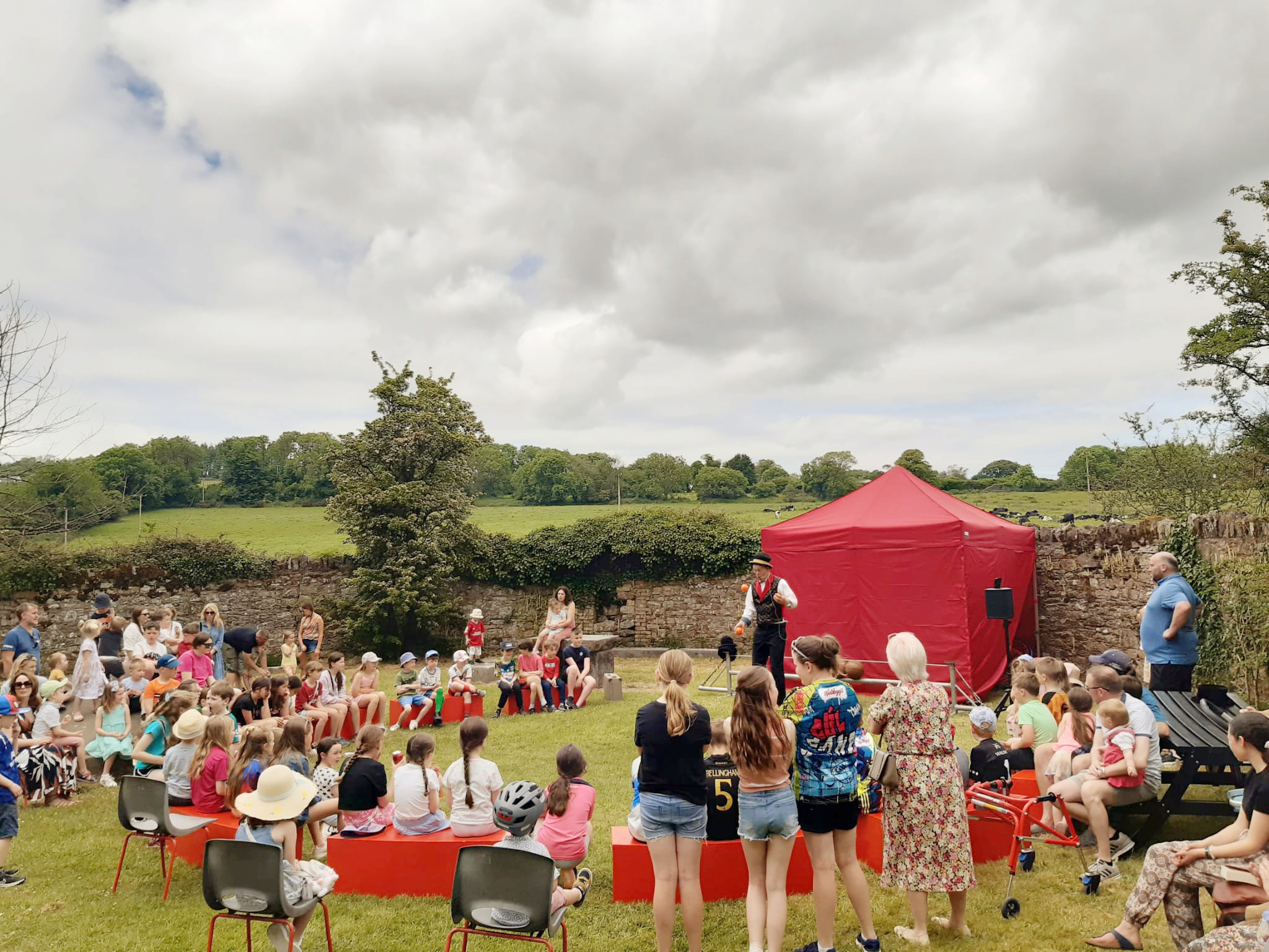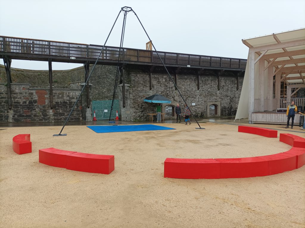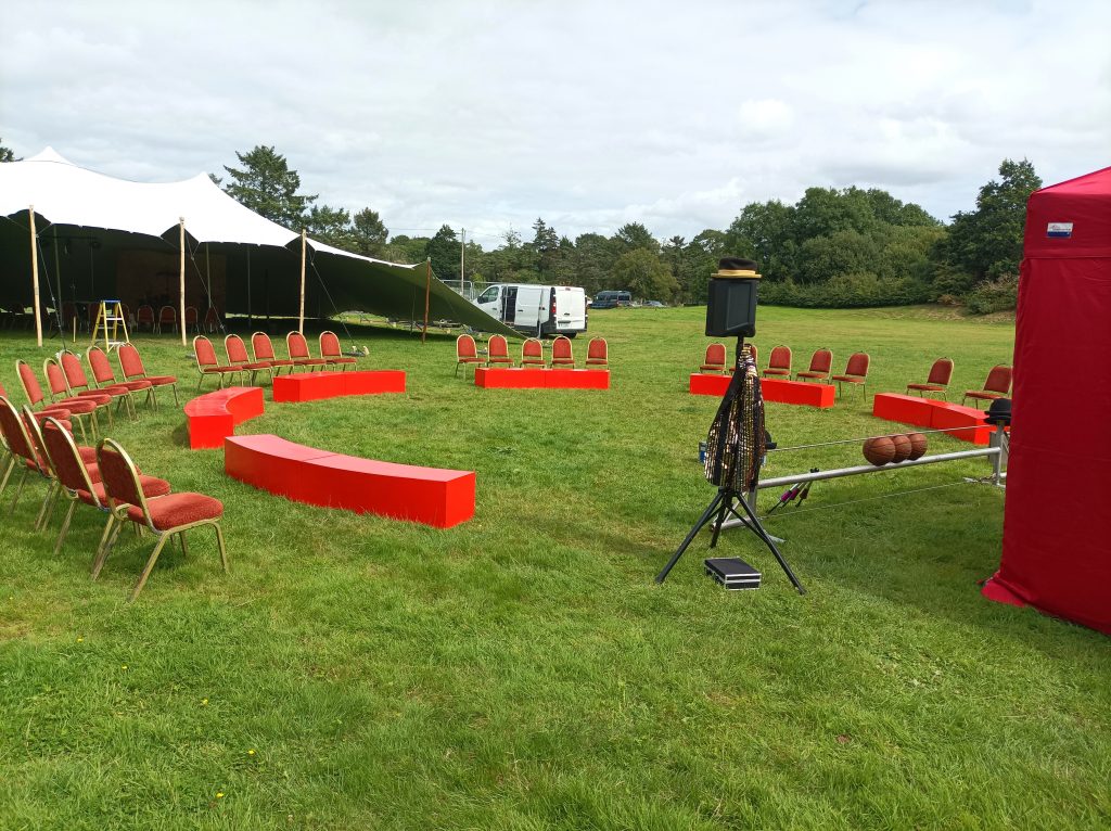 Our circus ring stage is 20ft round joined up or can be spread out to create a larger space. It can also be configured for a smaller space 10ft x 15ft.